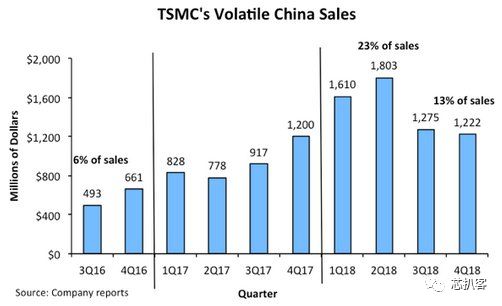 IC Insights认为,BitMain自2016年以来加密货币采矿设备销售额的急剧上升和下降是台积电在中国代工厂销售过去两年中大部分波动的原因。